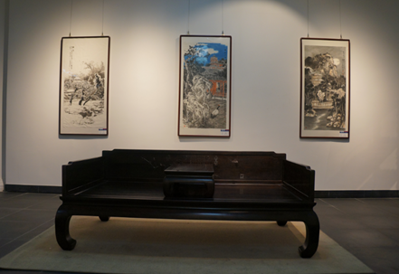 走进泓文博雅艺术馆的长廊,白墙灰瓦宛如水墨丹青,清幽淡雅的环境,凸显了墙上画作的中国韵味。