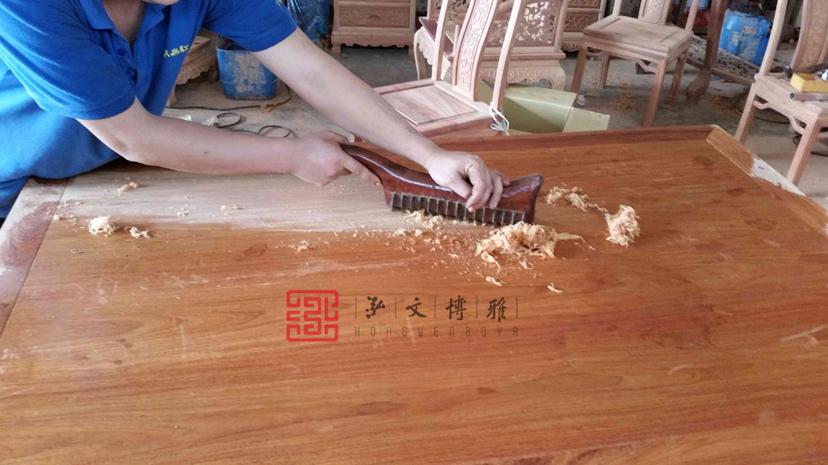 组装以后需要对家具表面进行刮磨处理。红木家具很多型面都需要纯手工打磨,一般先用刮刀刮磨,再用越来越细的砂纸分多次进行打磨,一直要把较粗砂纸的痕迹磨掉。刮磨后的半成品家具线条流畅,表面平坦无波浪感,纹理流畅清晰,手感也变得平滑舒适。