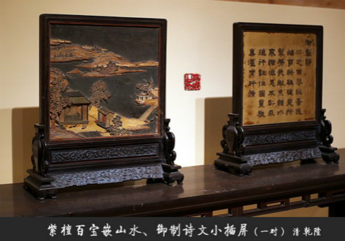 明晚期的黄花梨楼台人物博古纹屏风,每扇屏风的上、下部分别用宽约30厘米的整块黄花梨木材雕成博古纹,中间镶嵌楼台人物画卷,体量庞大,格外精美。