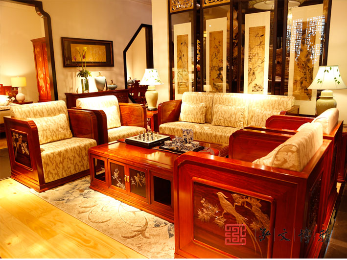 丝翎檀雕如羽毛般细腻的雕刻,比刺绣、牙雕还要精细、精美,与温润如玉的红木家具交相辉映,它不但完美地诠释了红木家具温润优雅的气质,泓文博雅凭借工艺、文化的突破与创新,传承了红木家具及中国国画悠久且璀璨的历史。