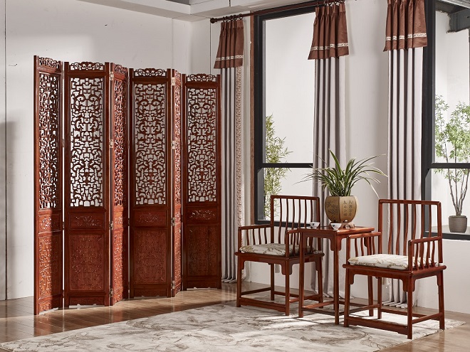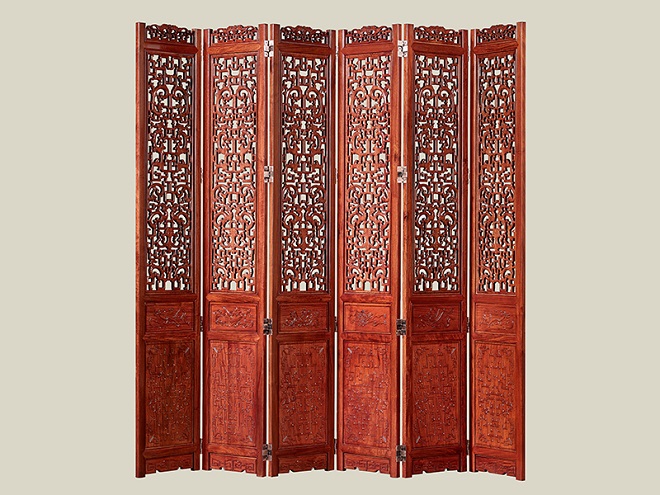 屏风每扇用横木分成4个部分,每扇之间用纯铜合页相连,伸缩自如,屏风可长可短,适用各种空间。