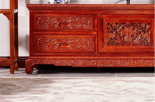 抽屉及柜门融合浮雕和透雕工艺,饰花中之王---牡丹,极具中式古典风格,寓意花开富贵、繁荣昌盛。