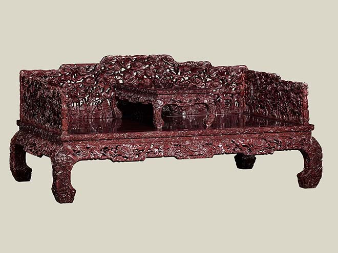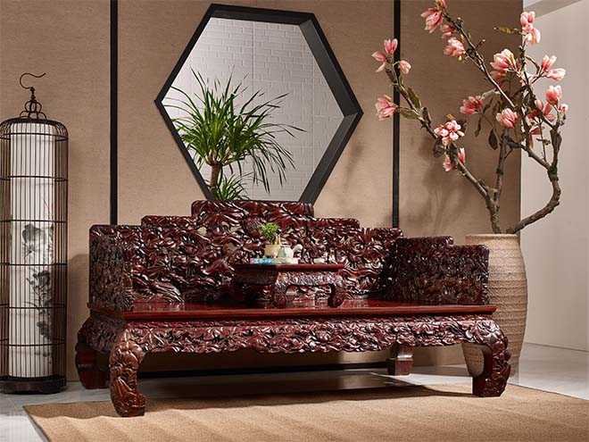 此款罗汉床完全仿照故宫博物院收藏的荷花罗汉床制作,器型硕大,用料厚重,雕花繁而不乱,具有清新自然的艺术效果。