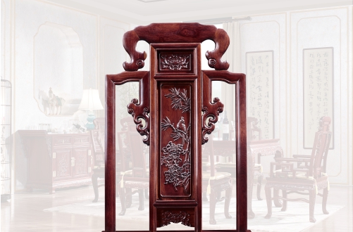 主人椅背板雕松鹤图,为松鹤延年、富贵长寿之意;四把宾椅均浮雕各不相同的花鸟图,灵动有趣,让人仿似置身于鸟语花香的世界。