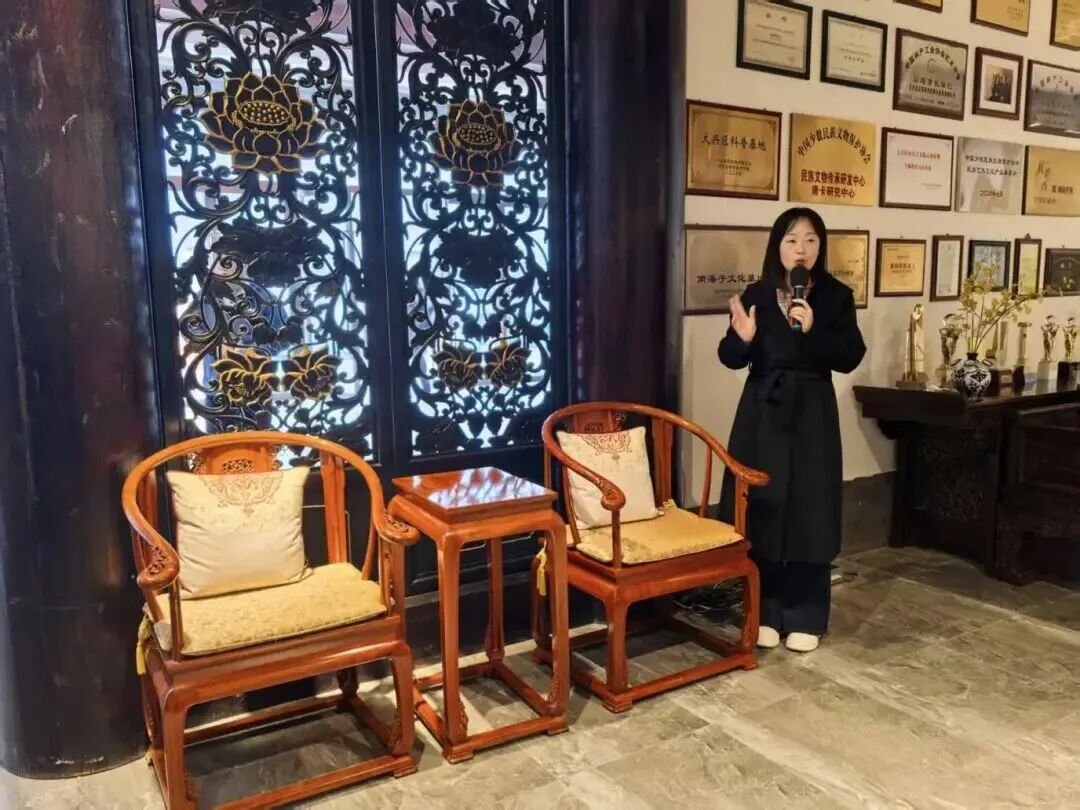 统战团体成员在专业讲解员的引导下走进友联红木馆,在日常生活中十分常用的圈椅,承载着中式美学的美好寓意;背圈为圆象征“天”,椅盘为方代表“地”,人坐其中暗含“天时地利人和”的寓意,双手搭在背圈恰似“左膀右臂”相伴;背板选用带“山峰纹”的木材,更藏着“背后有靠山”的吉祥期许。表面采用国家非遗大漆工艺,从天然漆树割口取漆(素有 “百里千刀一两漆” 的说法),再经数十遍手工擦涂,既具备防腐、耐潮、隔热的实用属性,又不影响木材自然 “呼吸”。