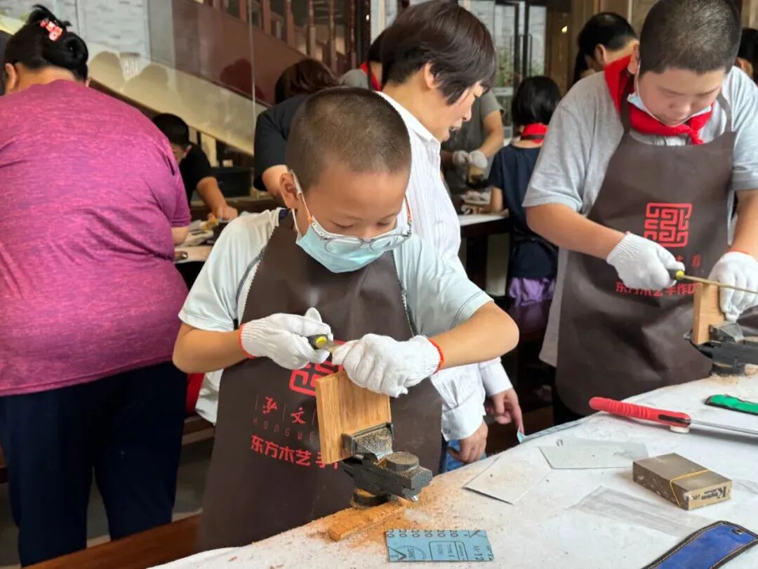 木作工坊:从木屑飞扬到温润成器;最令人期待的实践环节,青少年们体验了动手制作天然木材茶杯垫。孩子们化身"小木匠"。拉锯声中,原木块渐成杯垫雏形;砂纸打磨下,粗糙表面泛起琥珀色光泽。当亲手制作的茶杯垫映着阳光定格时,映出一张张满是成就感的笑脸。